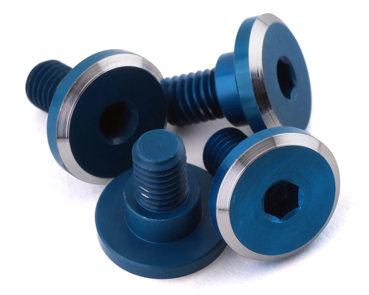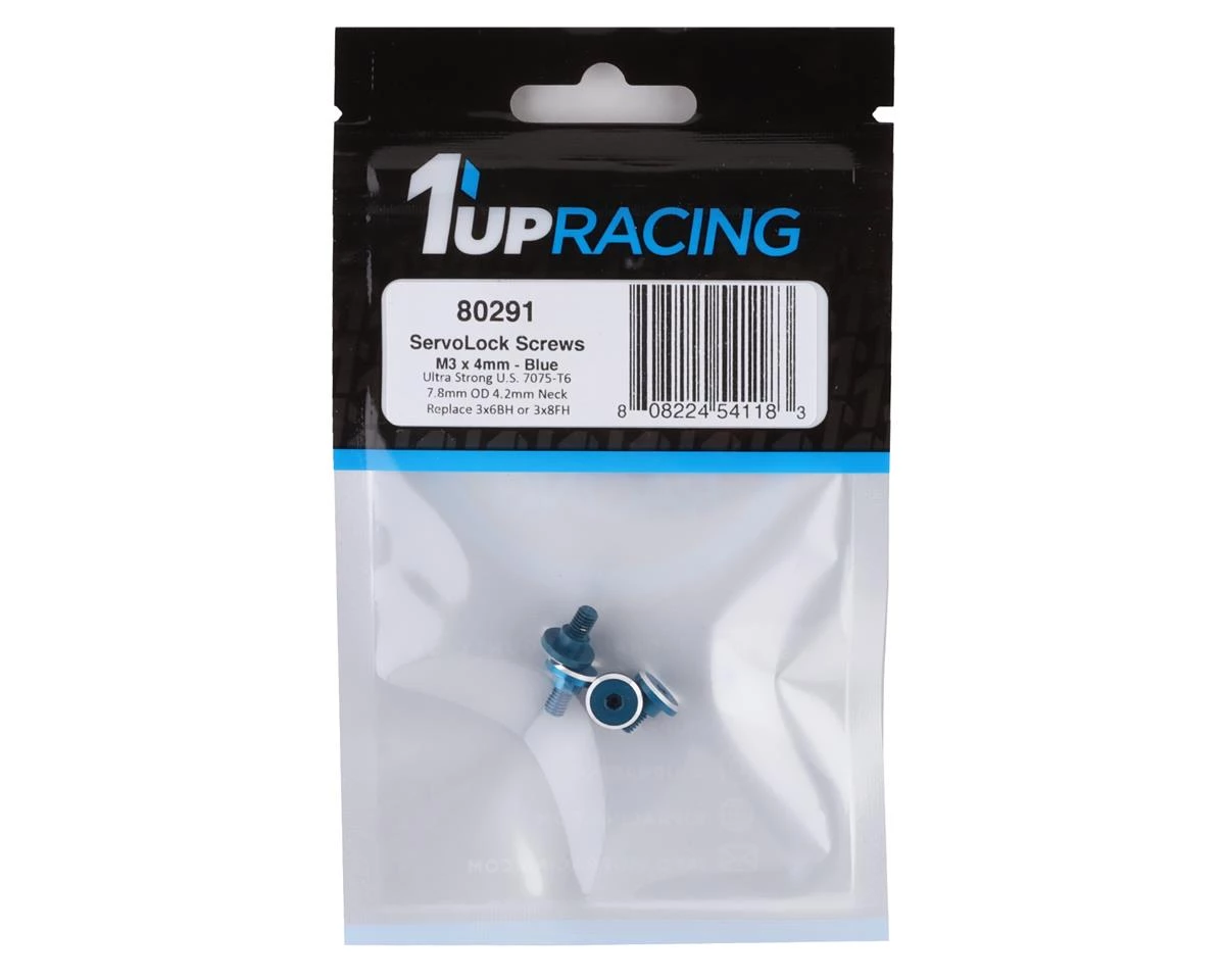 This set of four 1UP Racing 4.2mm Neck 3x4mm Aluminum Servo Mounting Screws is a great option for securely mounting your servo with style, and is a great substitute for 3x6mm button head or 3x8mm flat head screws. This set is machined from ultra-strong U.S. 7075-T6 aluminum and blue anodized with a beautiful mirror-like chamfer. The screws fit snuggly into the servo ears thanks to a 4.2x2mm neck for electric use or 3.0x2mm neck for nitro use. A large 7.8mm outer diameter head ensures everything stays secure.
