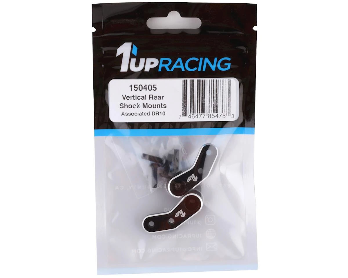 This optional set of 1UP Racing DR10 Vertical Shock Mounts are intended for use with the Team Associated DR10. These parts bolt to the stock towers and allow the rear shocks to mount in a more vertical position, helping to create shock geometry that is better suited to drag racing applications. These are precision machined from aluminum and feature a black anodized finish with chamfered edges to add a flashy look to the parts.