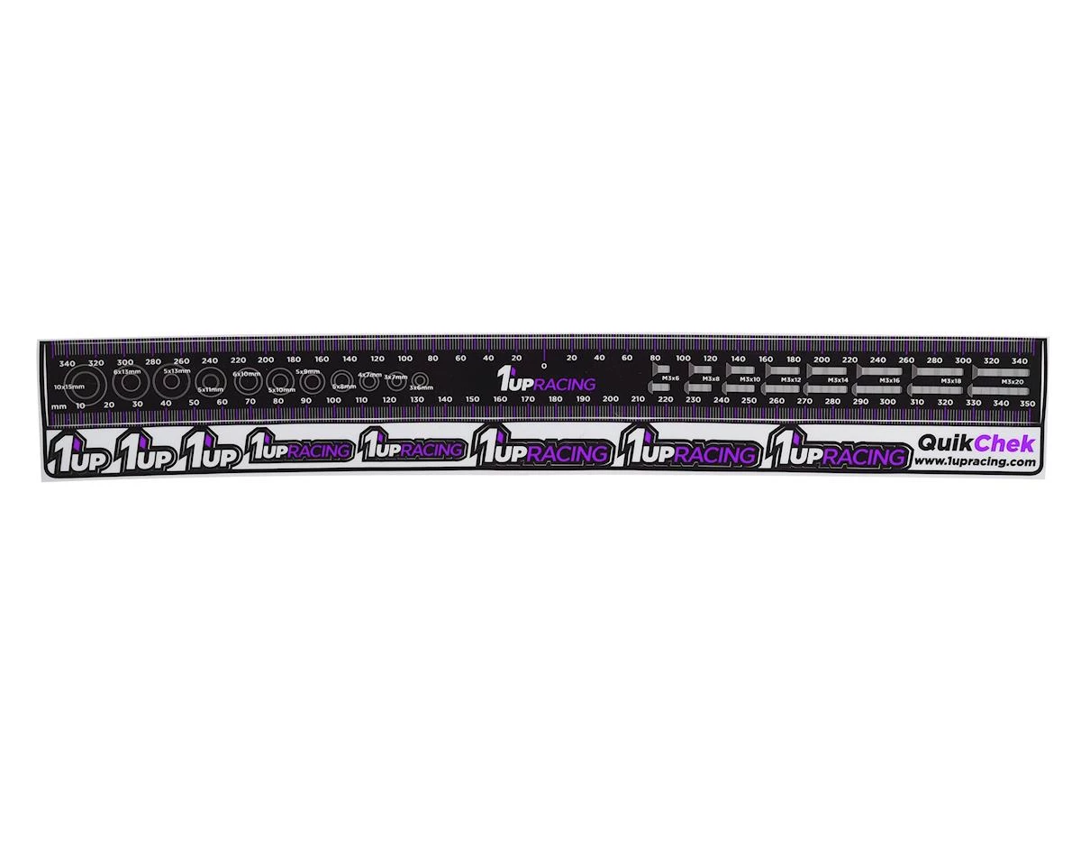 Apply the 1up Racing QuikChek decal to your pit board or desk for Quik reference of wheelbase, popular bearing and screw sizes, and a ruler!