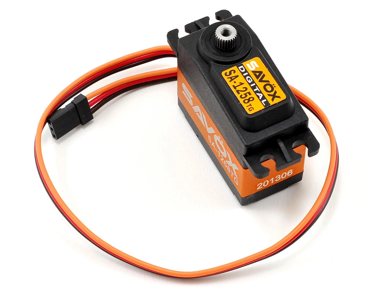 This is the Savox SA-1258TG Standard Digital “High Speed” Titanium Gear Servo. The SA-1258TG combines leading edge technology with super high 12-bit (4096) resolution and titanium and aluminum gears for one amazing servo! With titanium and aluminum gears, this servo is truly magical. Pushing 167 ounces of torque and a blistering .08 transit time, this servo is redefining what an all-around servo should be capable of. This is a great upgrade to most comparably priced servos. The minimized backlash on the SA-1258TG is helpful in plane wings for greater accuracy and less gear play.