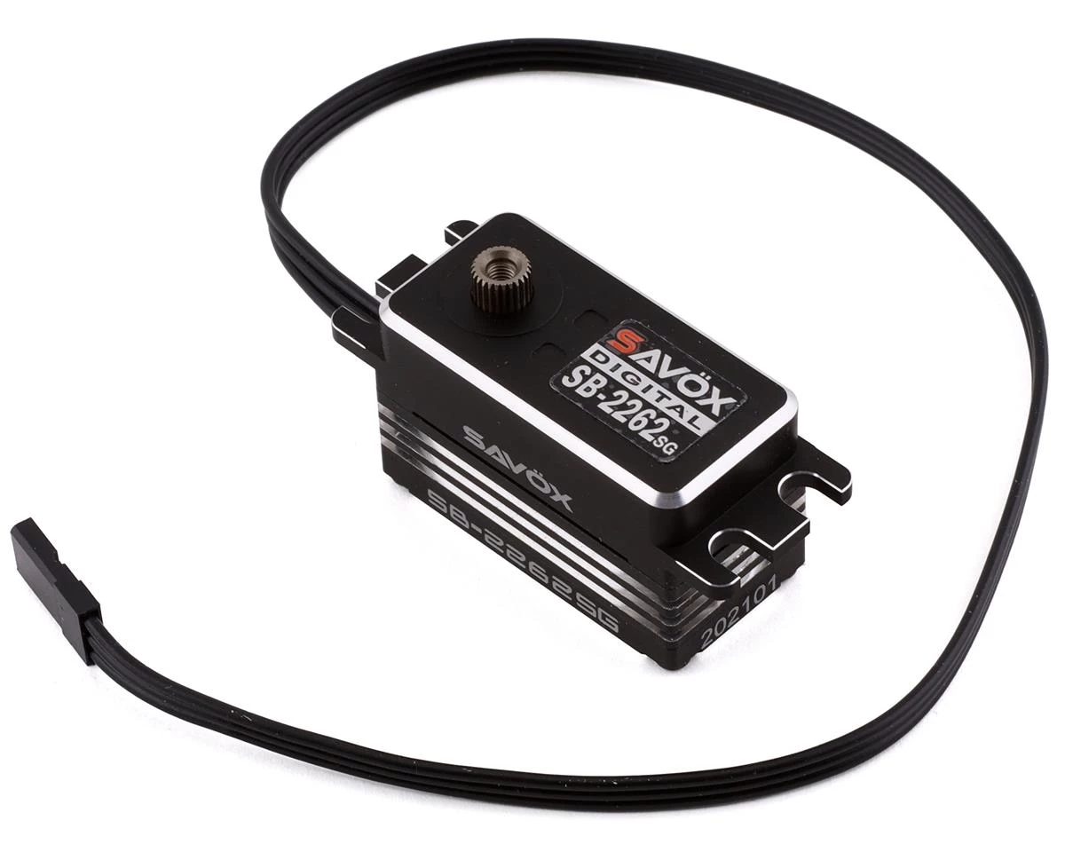 Savox SB-2262SG “High Torque” Low Profile Brushless Steel Gear Digital Servo. This servo comes from Savox’s Monster series and feature an aluminum case and unique brushless motor to supply monster power. Package includes one low profile servo, three servo horns and mounting hardware.