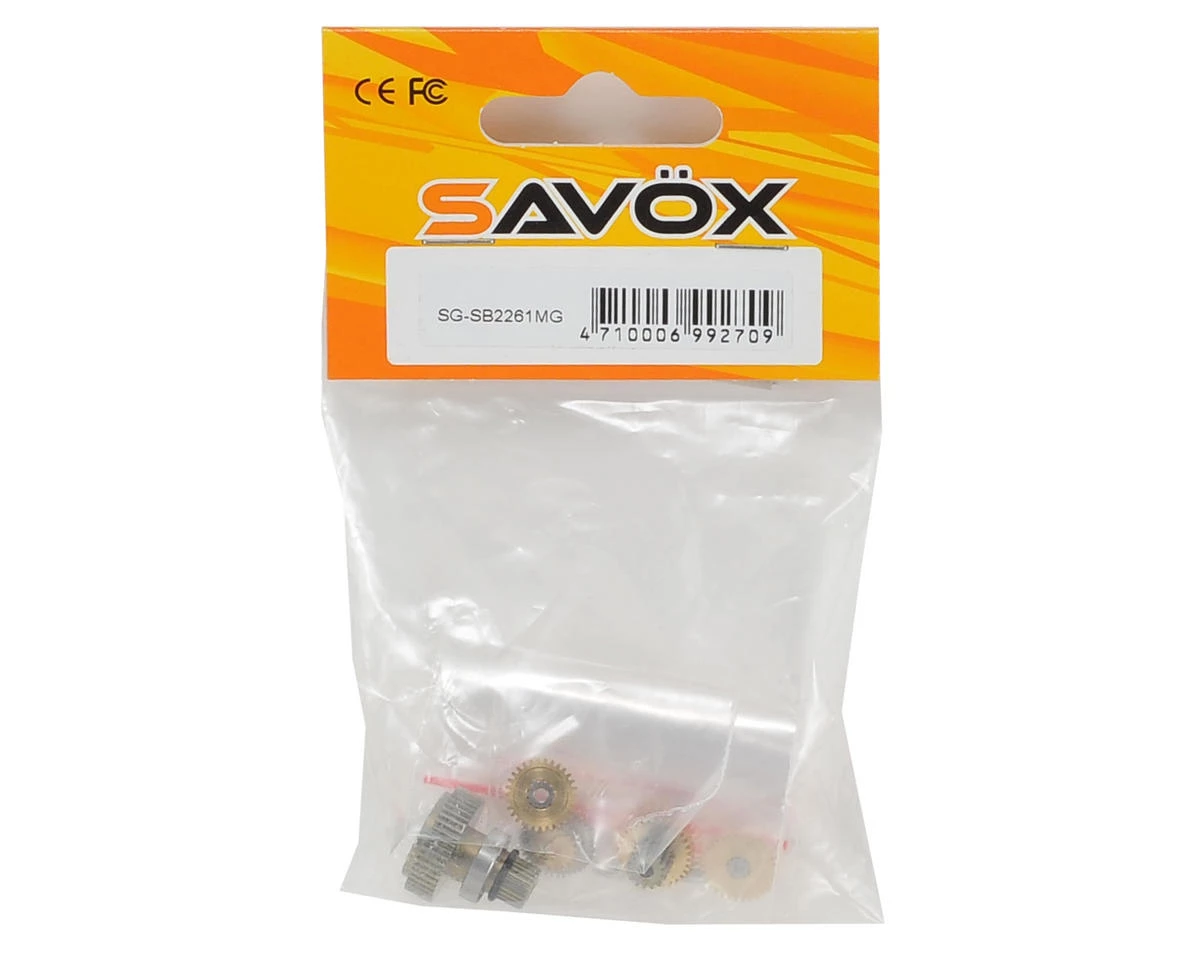 This is a replacement Savox SB2261MG Metal Gear Set. Package includes servo gears, main gear with factory installed bearing and pins.Â