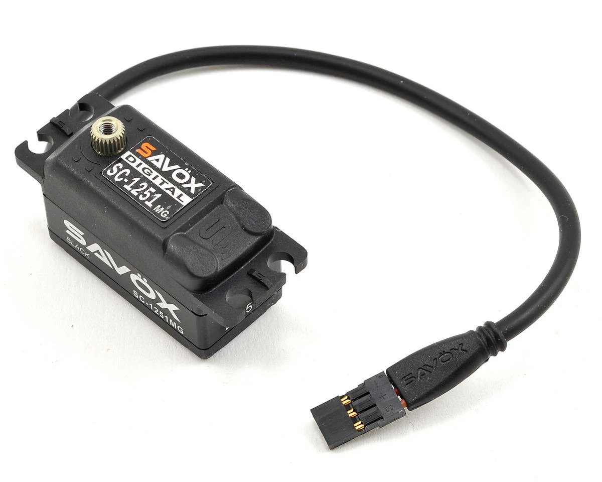 Savox’s SC-1251MG Black Edition Low Profile Digital “High Speed” Metal Gear Servo features a sleek black aluminum center case with laser etched details, as well as a 70mm long heavy duty lead wire. The Savox SC-1251MG combines leading edge technology, with super high 12 bit (4096) resolution and Metal Gears. With it’s low profile case, the SC-1251MG is ideal for most 1/10 onroad and 1/10 buggy applications, as well as aileron servos in gliders and airplanes that have thin wing profiles.