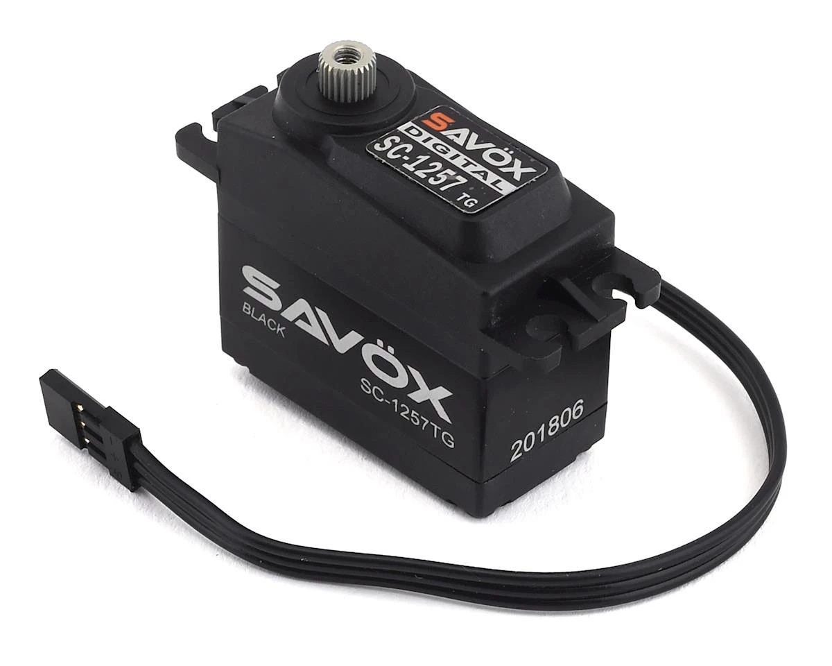 Savox’s SC-1257TG-BE Black Edition “Super Speed” Digital Titanium Gear Servo features a sleek black aluminum center case with laser etched details, as well as a 250mm long lead wire. The Savox SC-1257TG-BE combines leading edge technology with super high 12 bit (4096) resolution and Titanium Gears. It produces 138 oz-in and .07 transit speed at 6.0V, making it a great option for 1/10th scale 2wd buggies.